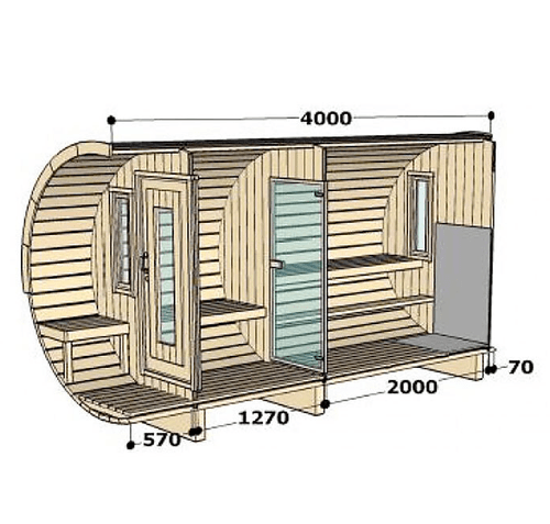 Tynnyrisauna DeLuxe maisemaikkunalla, pukuhuoneella ja etuterassilla
